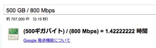 Google電卓で、転送速度の計算までできちゃうだと・・・? - IDEA*IDEA 〜 百式管理人のライフハックブログいろいろ試しましたが、「GB」とか「Mbps」は大文字小文字を区別するらしいです。あと「gigabytes」もOK(Gigabytesは×)。